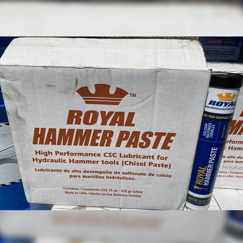 Royal Hammer Paste also known as “Chisel Paste’ is a high performance grease, specifically designed for Hydraulic Hammers and other tools requiring anti-seize compound. Hydraulic Hammers and other such tools experience extreme shock and axial loads that can lead to rapid wear and tear of contact surfaces and guide bushings.